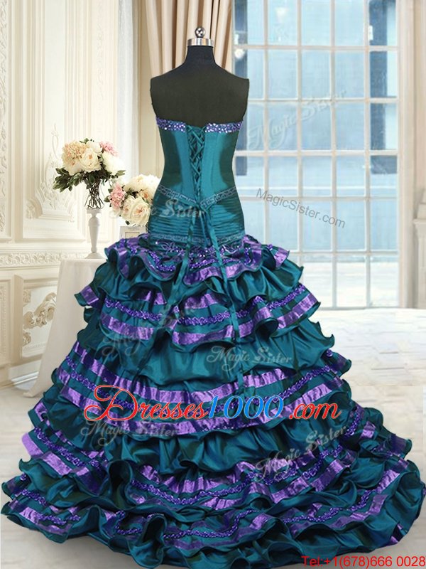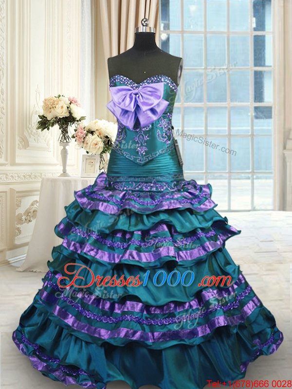 Peacock Green Quinceanera Gowns Taffeta Sweep Train Sleeveless Appliques and Ruffled Layers and Bowknot