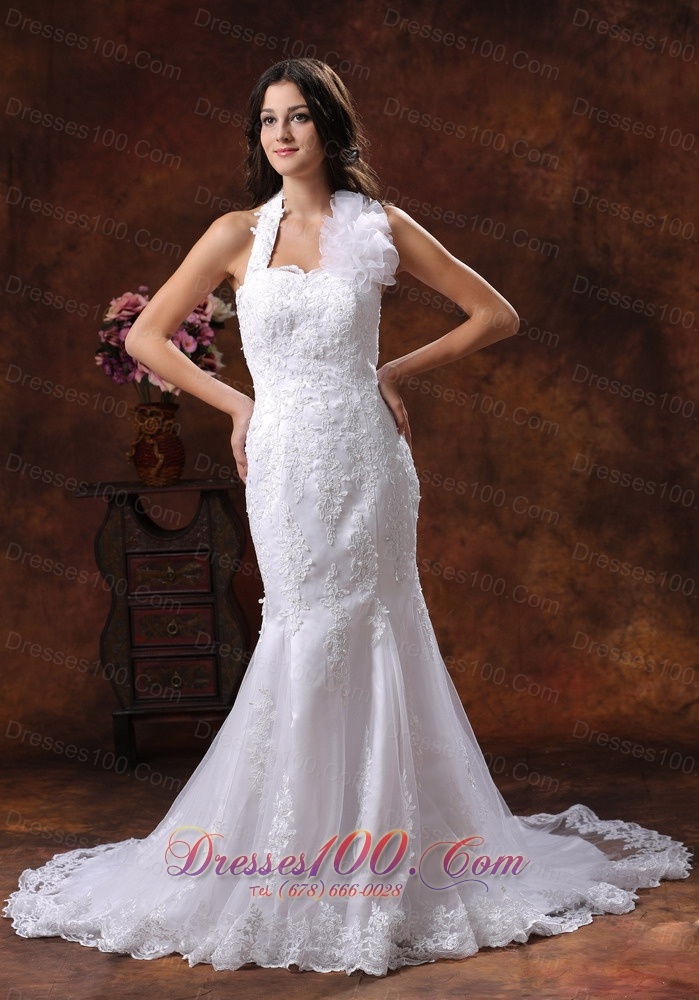 If you are the fashionist, this dress is for your taste! The dress features a wide halter top neck and one side of wide strap that has been accented by a bouquet of gorgeous fabric ruffles. The mermaid-style skirt hugs your frame, reaching the floor before extending into a sweeping train in the back. A very figure flattering design. Sure to be a new classic!