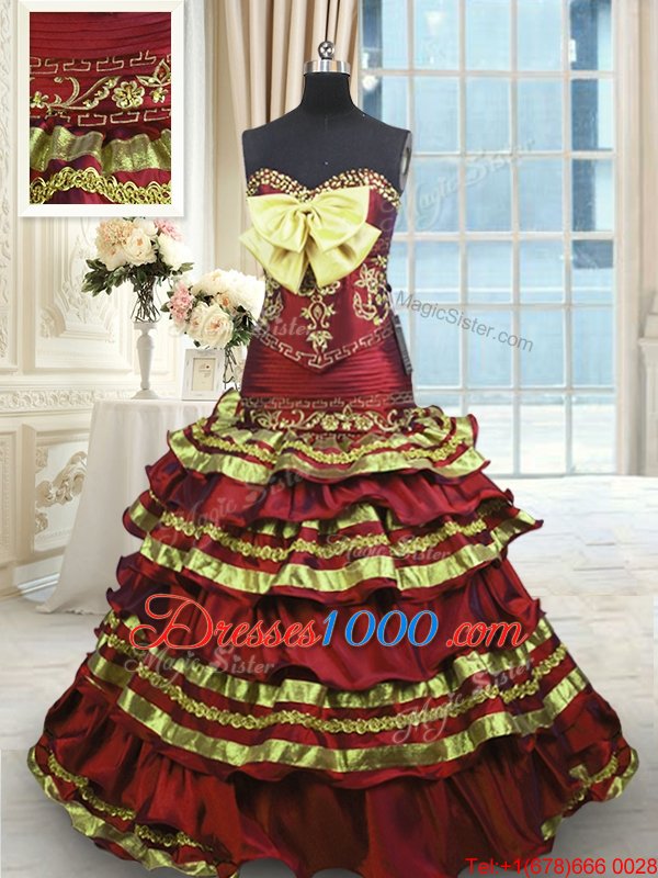 Fashion Wine Red A-line Taffeta Sweetheart Sleeveless Appliques and Embroidery and Ruffled Layers and Bowknot Lace Up Quinceanera Gowns Sweep Train