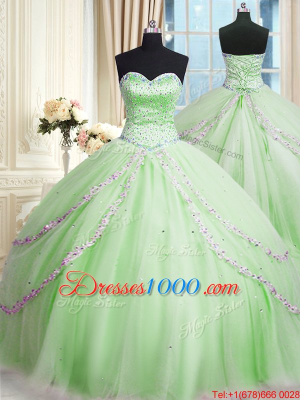 Apple Green Tulle Lace Up Quinceanera Gowns Sleeveless With Train Court Train Beading and Appliques
