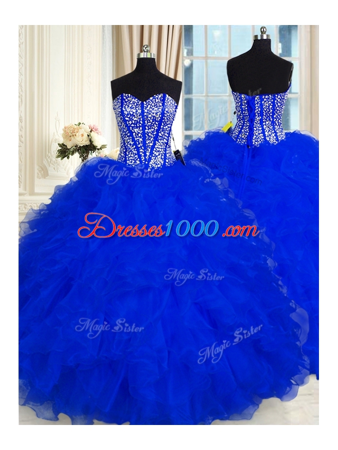 Discount Sleeveless Organza Floor Length Lace Up Sweet 16 Dress in Royal Blue for with Beading and Ruffles