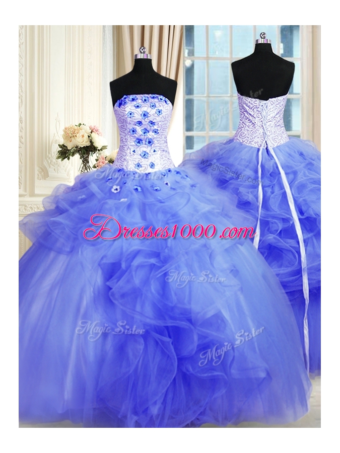 Flirting Floor Length Blue Sweet 16 Dresses Tulle Sleeveless Pick Ups and Hand Made Flower