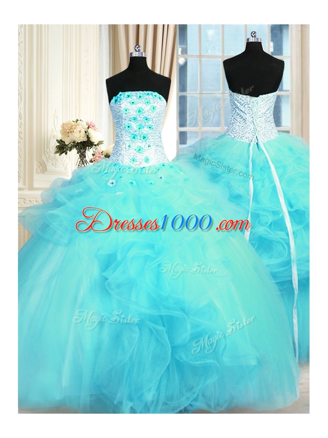 Decent Tulle Strapless Sleeveless Lace Up Pick Ups and Hand Made Flower Vestidos de Quinceanera in Aqua Blue