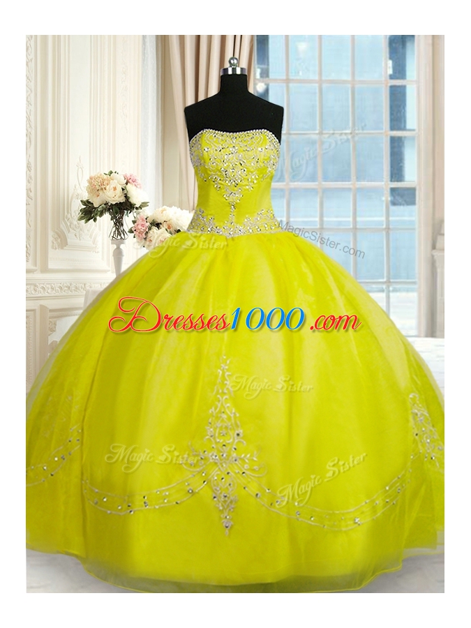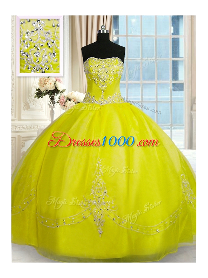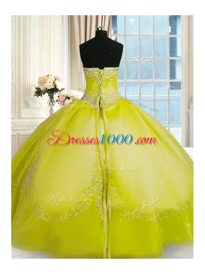 Strapless Sleeveless Quinceanera Dresses Floor Length Beading and Embroidery Yellow Green Organza