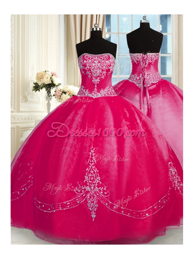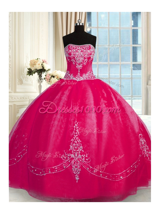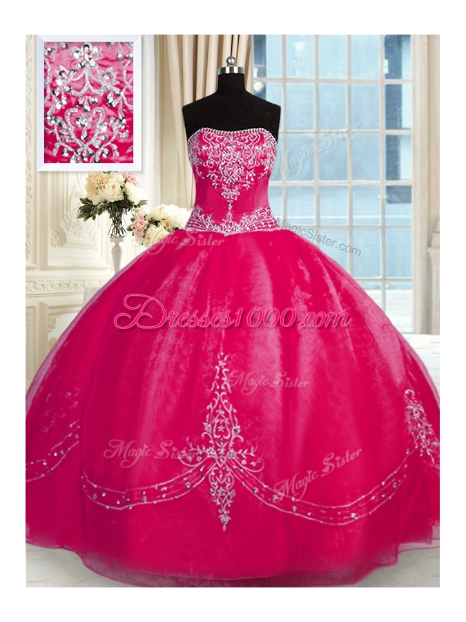Suitable Coral Red Strapless Neckline Beading and Embroidery Vestidos de Quinceanera Sleeveless Lace Up
