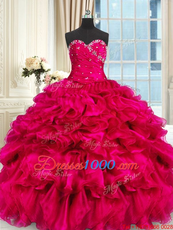 Hot Pink Organza Lace Up Sweetheart Sleeveless Floor Length Quinceanera Gowns Beading and Ruffles