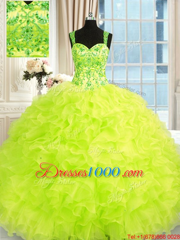 Yellow Green Lace Up Straps Beading and Embroidery and Ruffles Ball Gown Prom Dress Organza Sleeveless