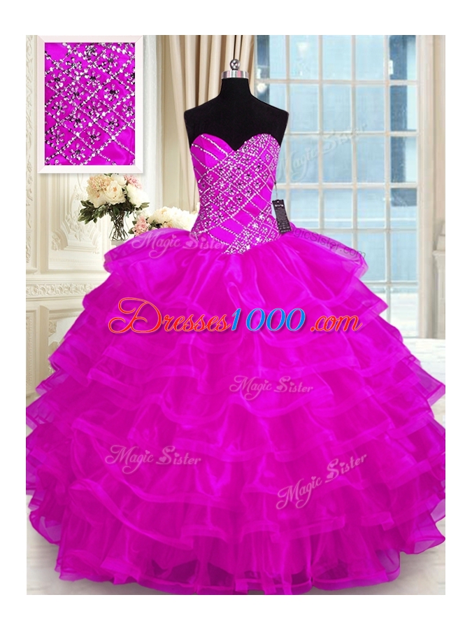 Fuchsia Sweetheart Neckline Beading and Ruffled Layers Ball Gown Prom Dress Sleeveless Lace Up