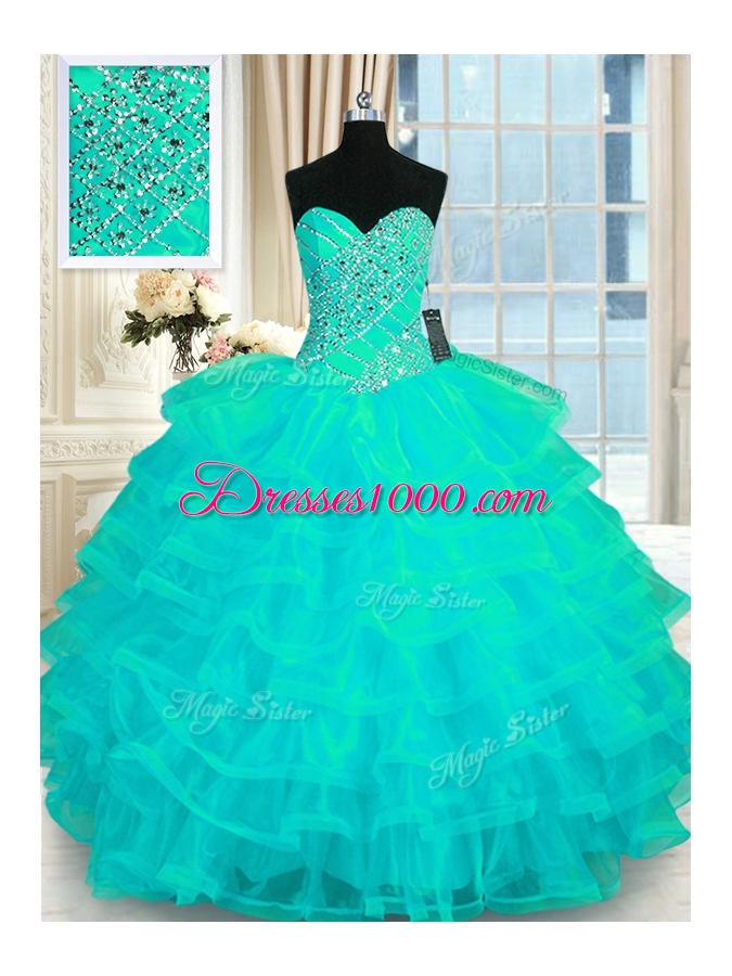 Gorgeous Turquoise Ball Gowns Beading and Ruffled Layers Quinceanera Gown Lace Up Organza Sleeveless Floor Length