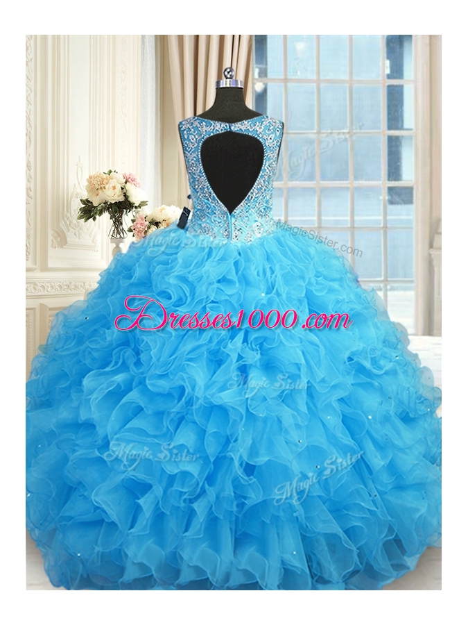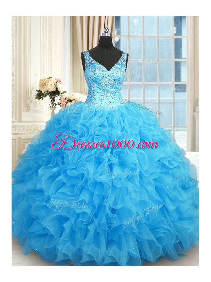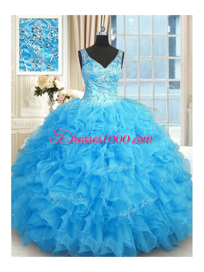 Fantastic Blue Zipper V-neck Beading and Ruffles Quinceanera Gown Organza Sleeveless