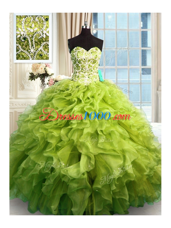 Excellent Olive Green Ball Gowns Organza Sweetheart Sleeveless Beading and Ruffles Floor Length Lace Up Sweet 16 Dress