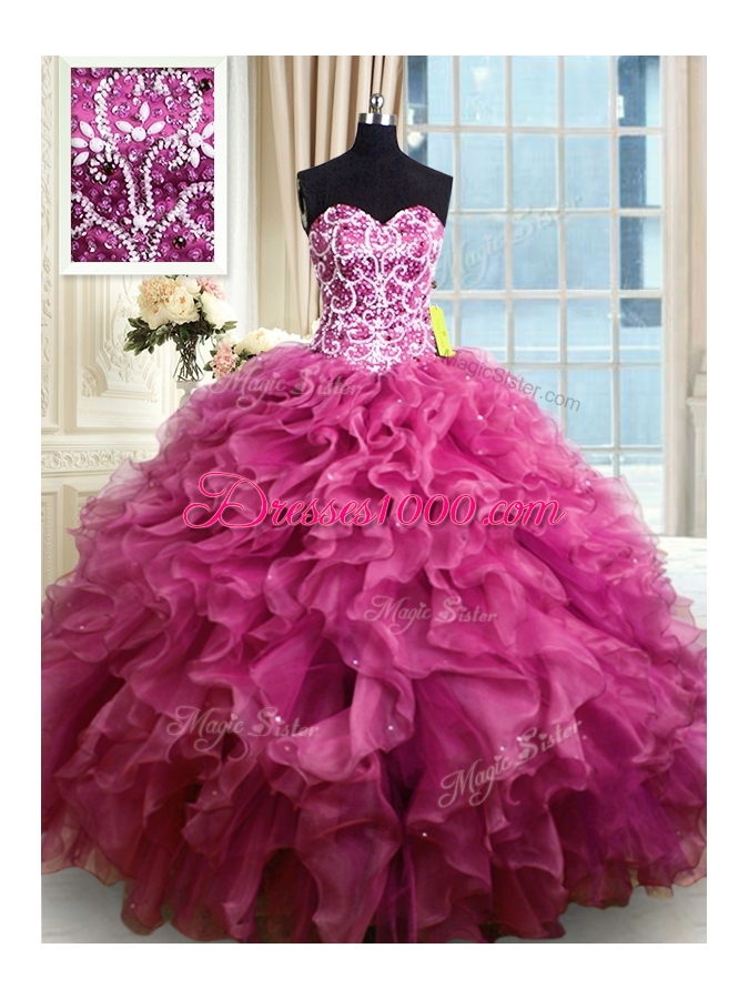 Customized Sleeveless Organza Floor Length Lace Up Quince Ball Gowns in Fuchsia for with Beading and Ruffles