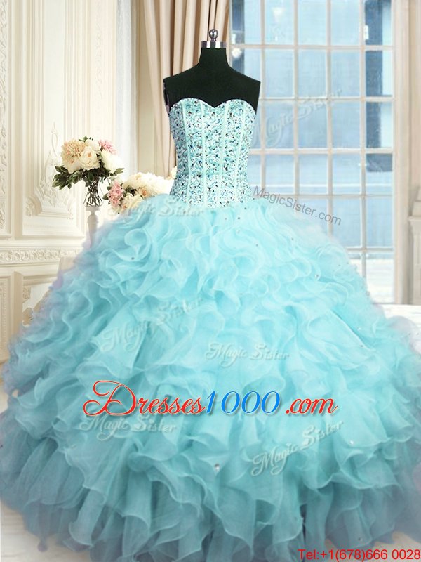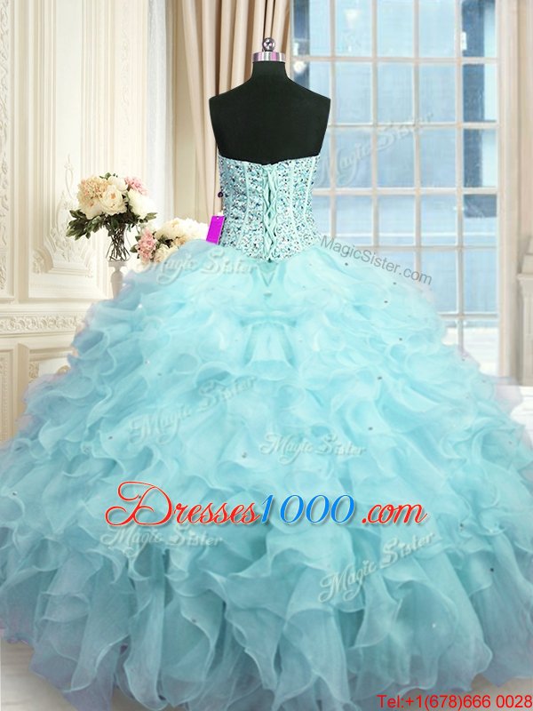 Free and Easy Baby Blue Organza Lace Up Sweetheart Sleeveless Floor Length Sweet 16 Dress Beading and Ruffles and Sequins