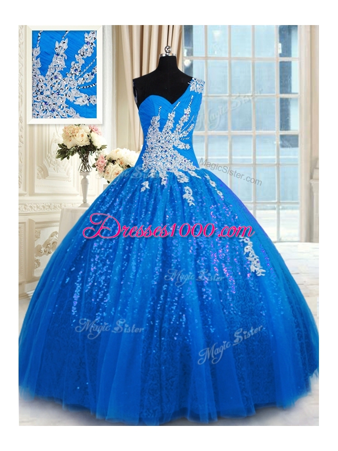 Artistic Floor Length Blue 15th Birthday Dress One Shoulder Sleeveless Lace Up