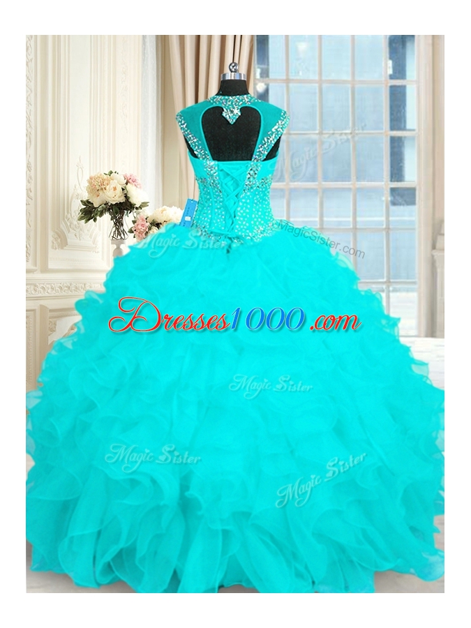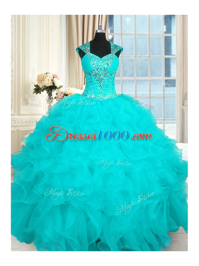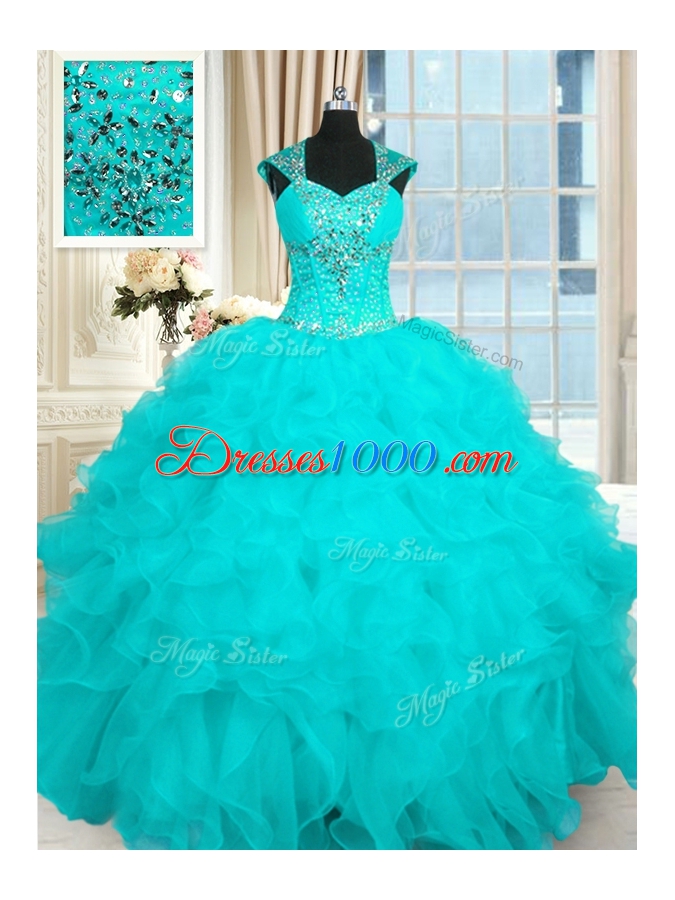 Aqua Blue Quinceanera Gown Military Ball and Sweet 16 and Quinceanera and For with Beading and Ruffles Straps Cap Sleeves Lace Up