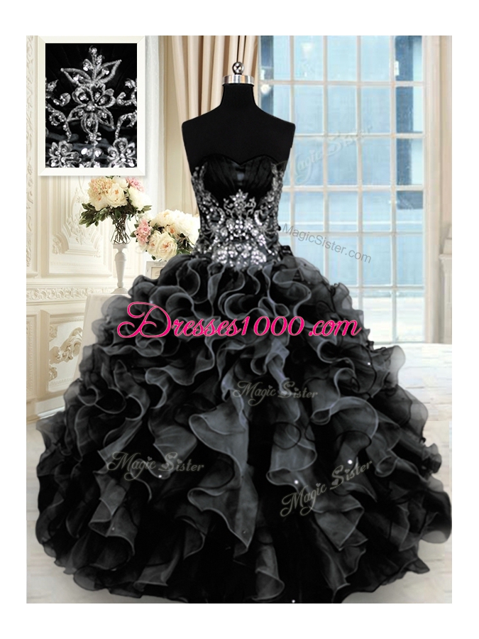 Stunning Black Lace Up Sweetheart Beading and Ruffles Ball Gown Prom Dress Organza Sleeveless