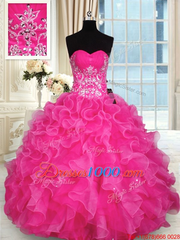 Floor Length Hot Pink Quinceanera Dress Organza Sleeveless Beading and Appliques and Ruffles