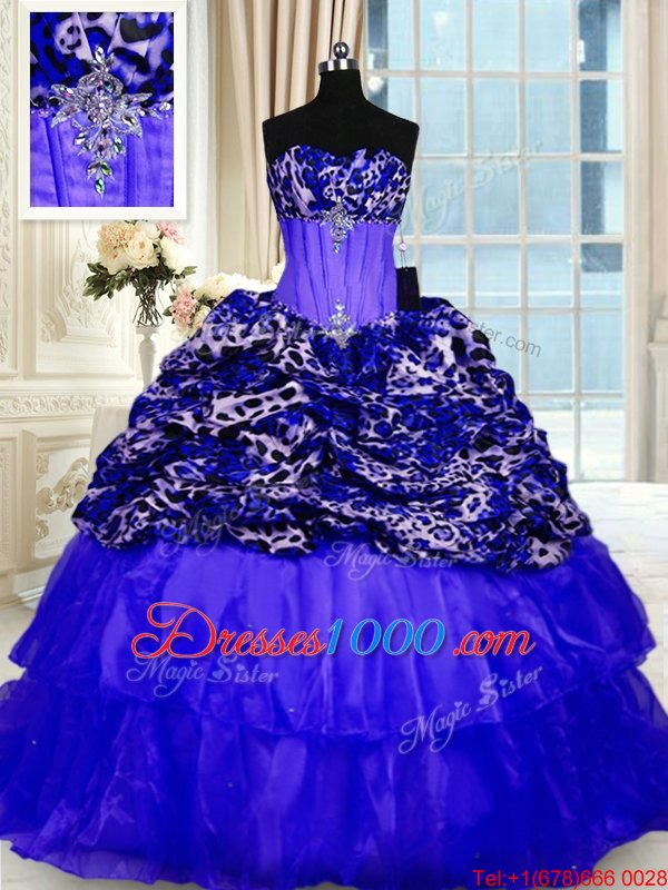 Wonderful Printed Royal Blue Lace Up Quinceanera Gowns Beading and Ruffled Layers and Sequins Sleeveless Sweep Train