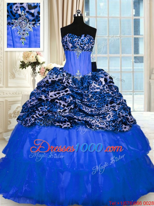 Blue Organza and Printed Lace Up Sweet 16 Dresses Sleeveless Floor Length Beading and Sequins