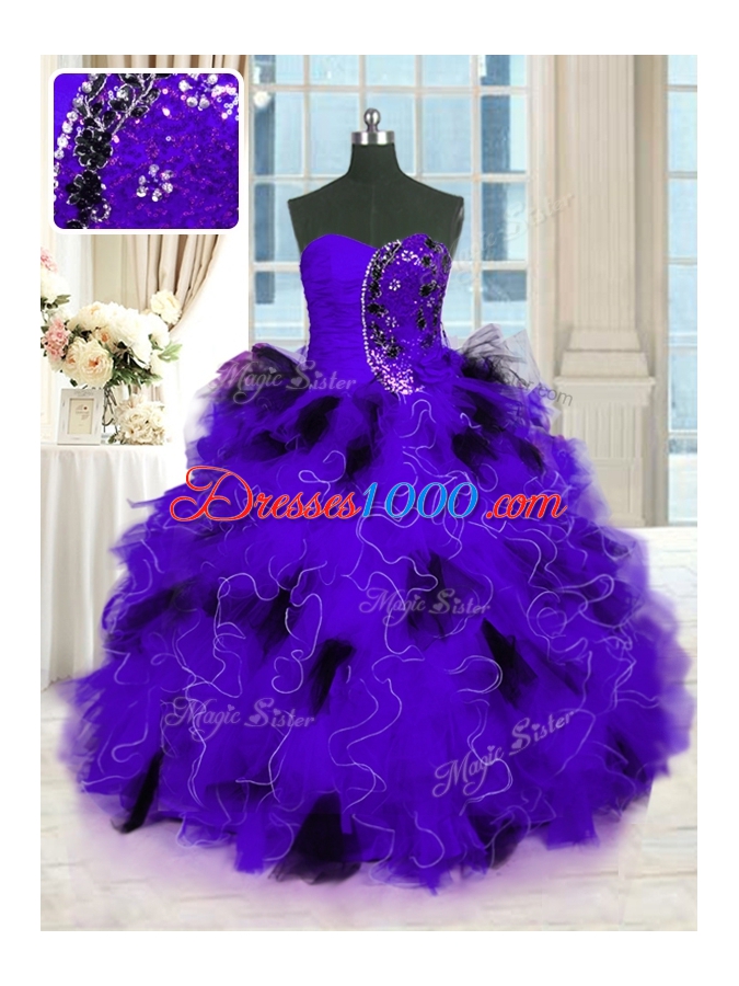 Elegant Strapless Sleeveless 15th Birthday Dress Floor Length Beading and Ruffles Black And Purple Tulle