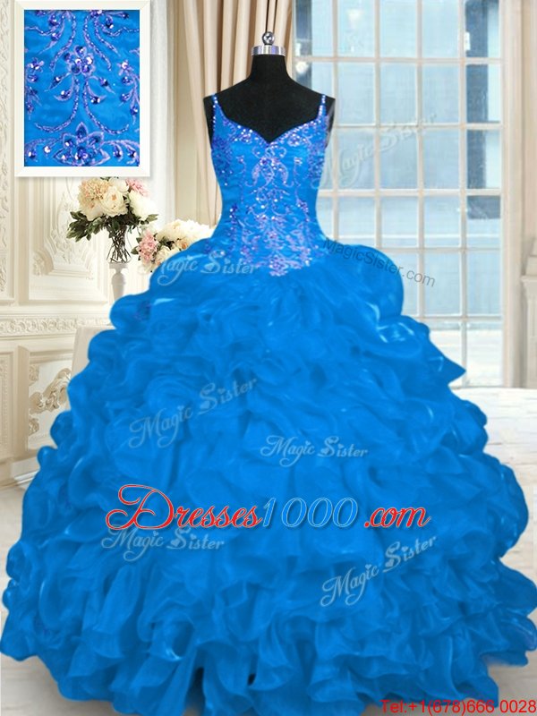 Nice Pick Ups Blue 15th Birthday Dress Spaghetti Straps Sleeveless Brush Train Lace Up
