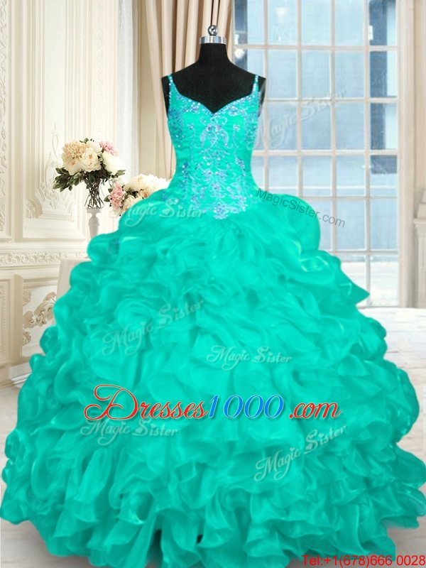 Simple Turquoise Ball Gowns Spaghetti Straps Sleeveless Organza Brush Train Lace Up Beading and Ruffles Quince Ball Gowns