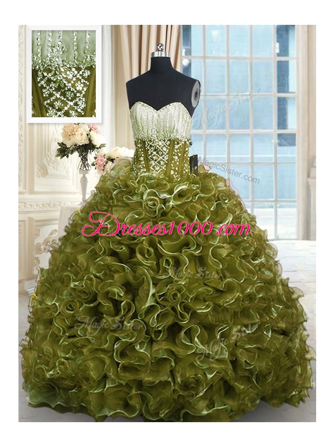 Lovely With Train Olive Green 15th Birthday Dress Organza Brush Train Sleeveless Beading and Ruffles
