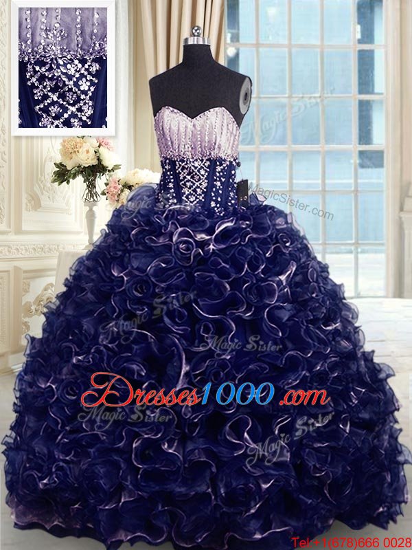 Romantic Brush Train Ball Gowns Vestidos de Quinceanera Navy Blue Sweetheart Organza Sleeveless With Train Lace Up