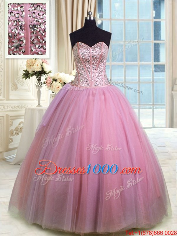 Rose Pink Organza Lace Up Quinceanera Gowns Sleeveless Floor Length Beading and Ruching
