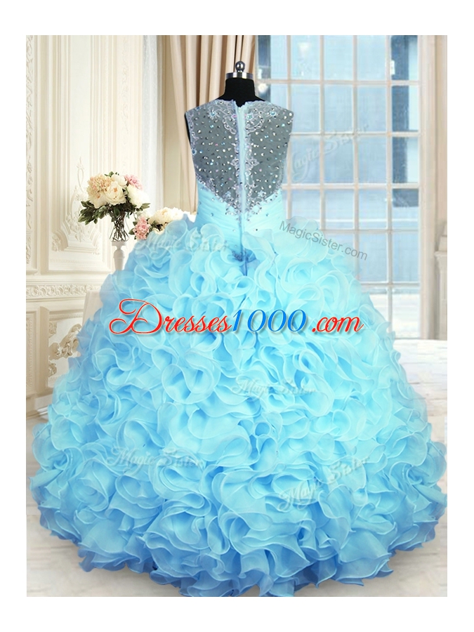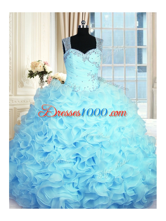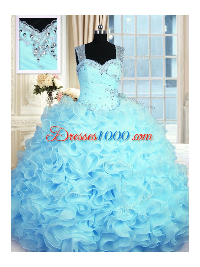 Aqua Blue Sleeveless Organza Zipper Ball Gown Prom Dress for Military Ball and Sweet 16 and Quinceanera