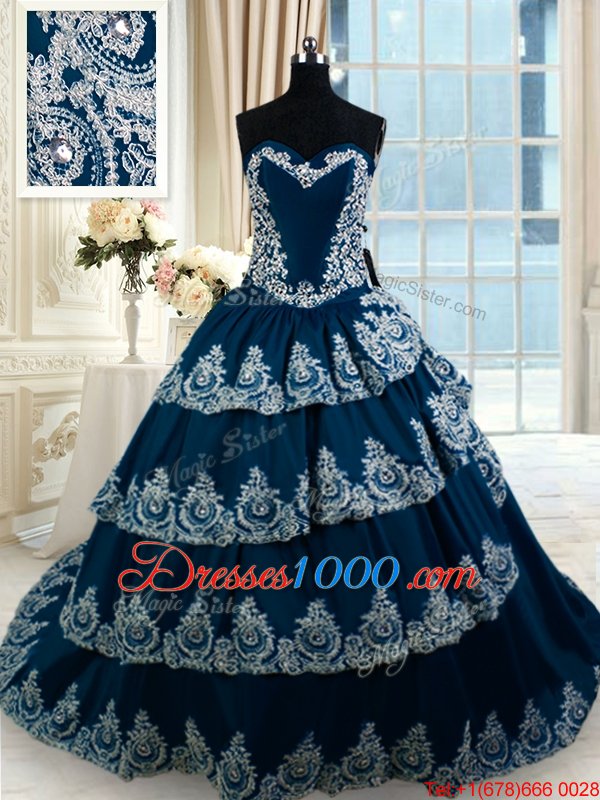 Cheap Navy Blue Taffeta Lace Up Quinceanera Gowns Sleeveless With Train Court Train Beading and Appliques and Ruffled Layers
