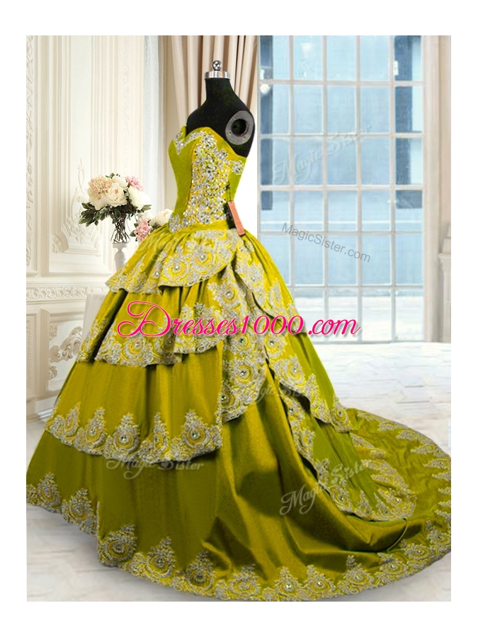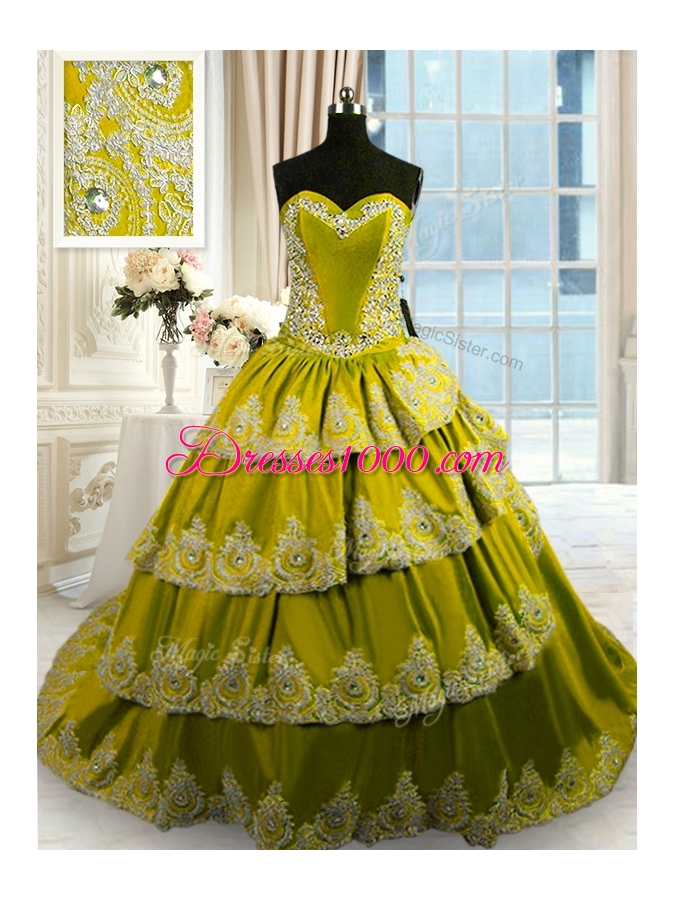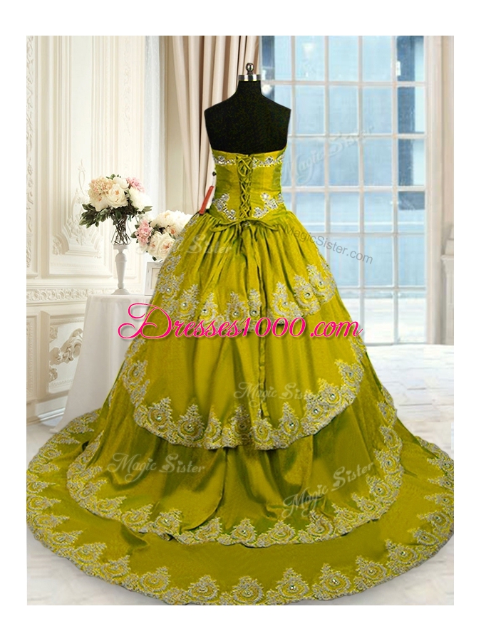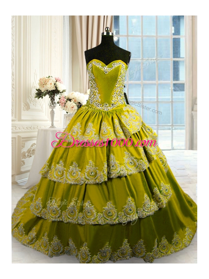 Ruffled Olive Green Sleeveless Taffeta Court Train Lace Up Quince Ball Gowns for Military Ball and Sweet 16 and Quinceanera