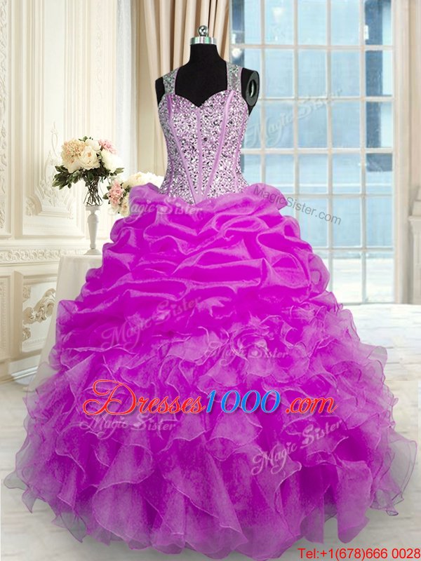 New Style Fuchsia Straps Zipper Beading and Ruffles and Pick Ups Sweet 16 Dress Sleeveless