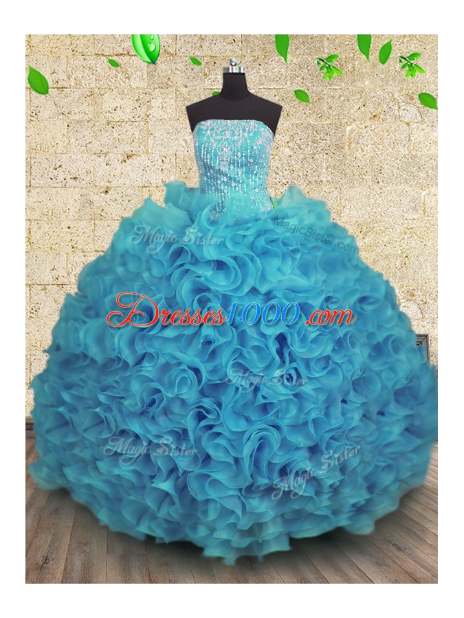 Glorious Aqua Blue 15 Quinceanera Dress Military Ball and Sweet 16 and Quinceanera and For with Beading and Ruffles Strapless Sleeveless Lace Up