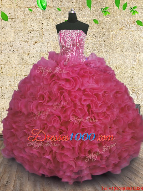 Floor Length Hot Pink Sweet 16 Dress Organza Sleeveless Beading and Ruffles