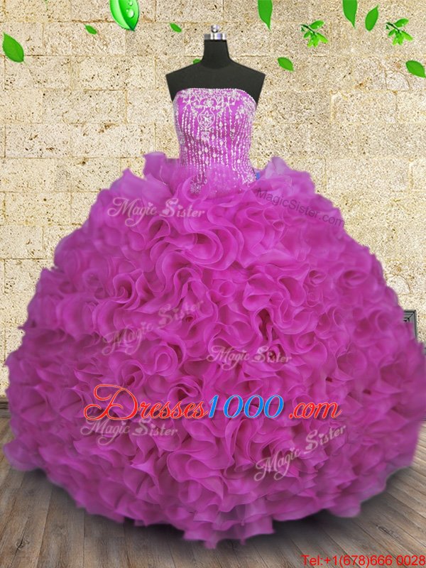 Fuchsia Quinceanera Gowns Military Ball and Sweet 16 and Quinceanera and For with Beading and Ruffles Strapless Sleeveless Lace Up