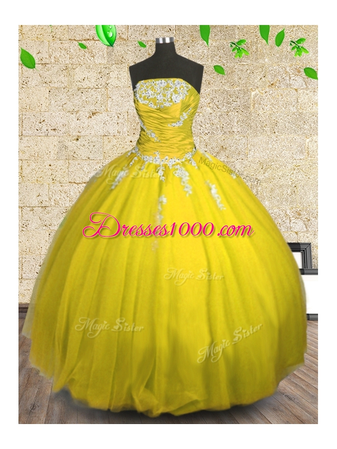 Appliques and Ruching Quince Ball Gowns Yellow Lace Up Sleeveless Floor Length