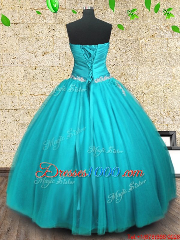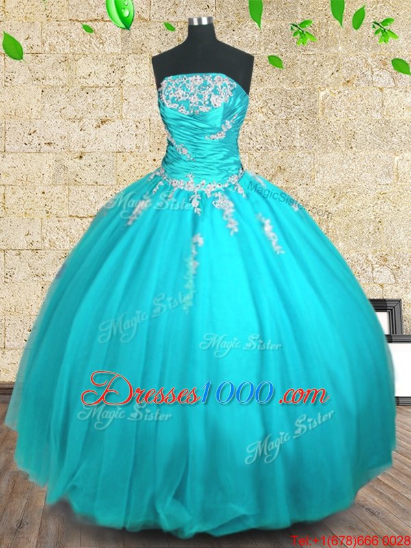 Most Popular Aqua Blue Lace Up Strapless Appliques and Ruching 15th Birthday Dress Tulle Sleeveless