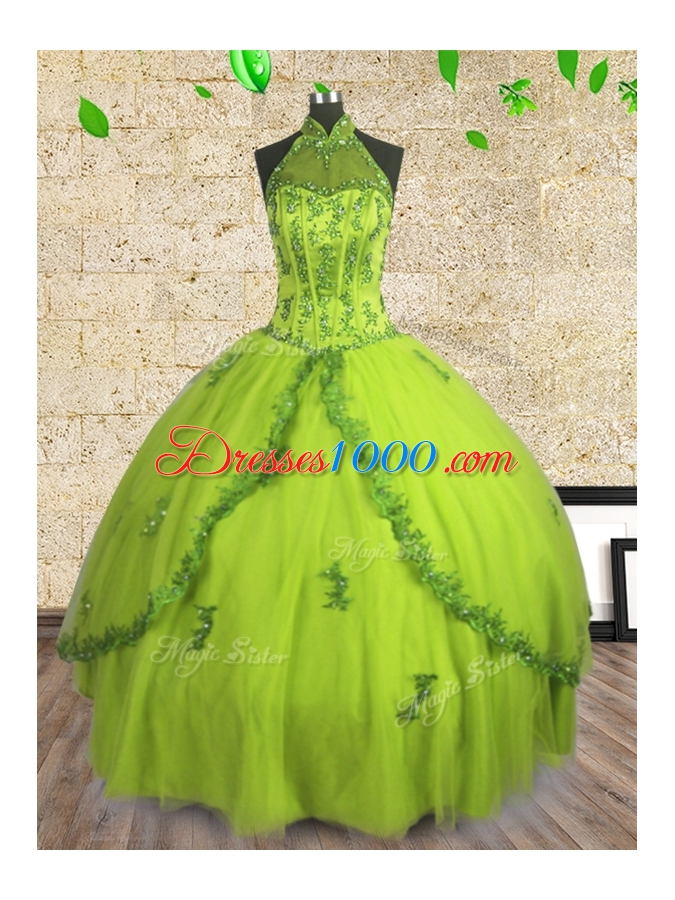 Halter Top Yellow Green Sleeveless Floor Length Beading Lace Up Quinceanera Gowns