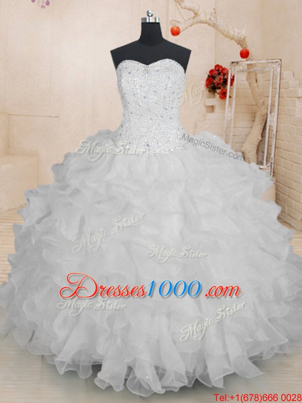 Custom Design Sweetheart Sleeveless Quince Ball Gowns Floor Length Beading and Ruffles White Organza
