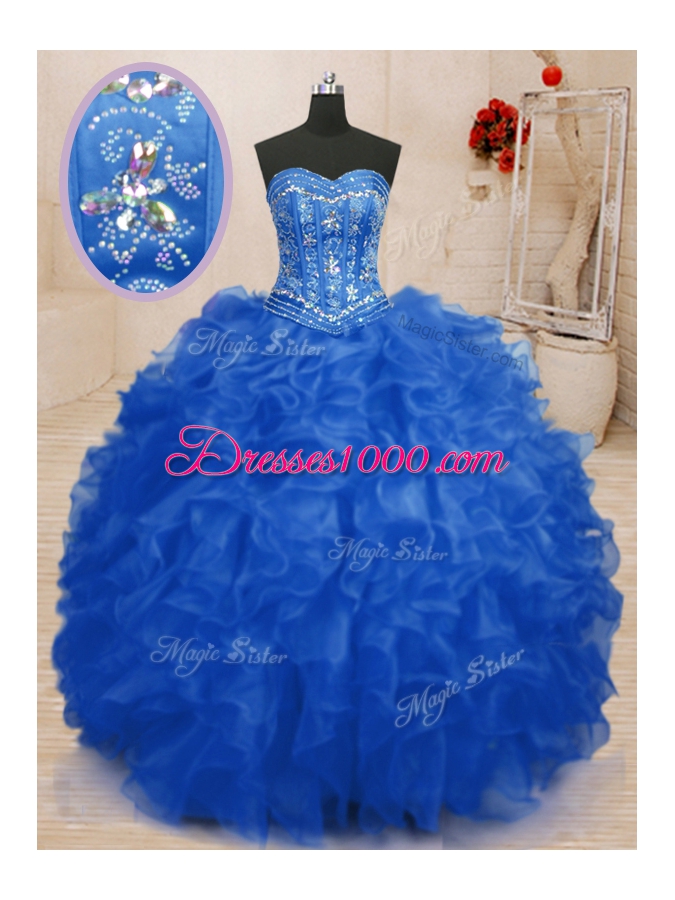 Modern Blue Sweetheart Neckline Beading and Ruffles Ball Gown Prom Dress Sleeveless Lace Up