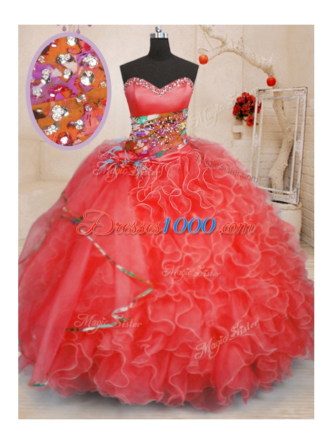 On Sale Sweetheart Sleeveless Quinceanera Gown Floor Length Beading and Ruffles Coral Red Organza