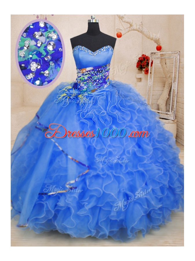 Fantastic Blue Sweetheart Lace Up Beading and Ruffles Sweet 16 Dress Sleeveless