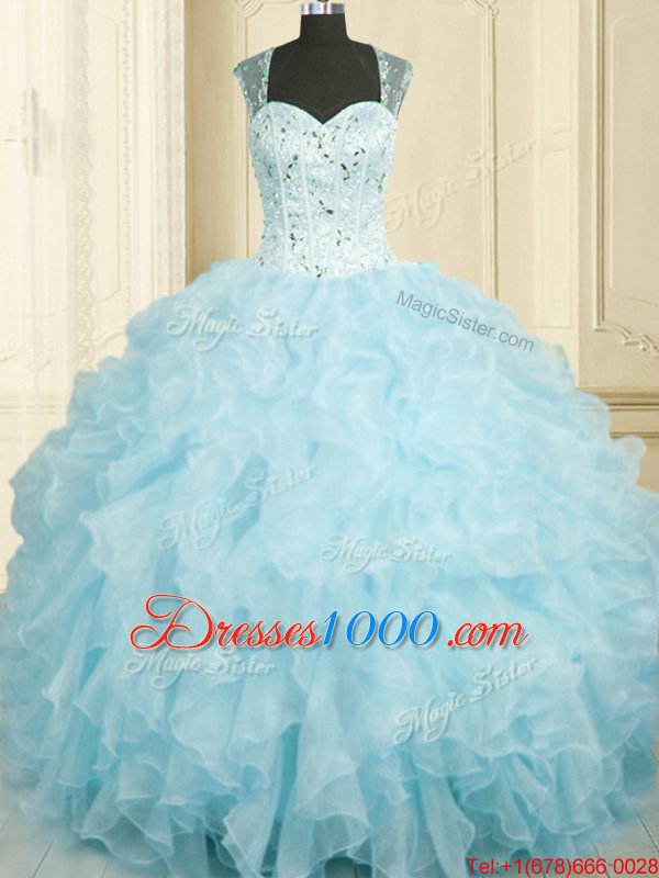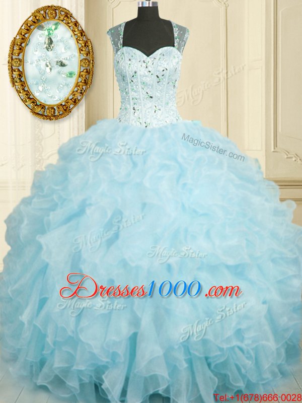 High End Ball Gowns Quinceanera Gowns Baby Blue Straps Organza Sleeveless Floor Length Lace Up