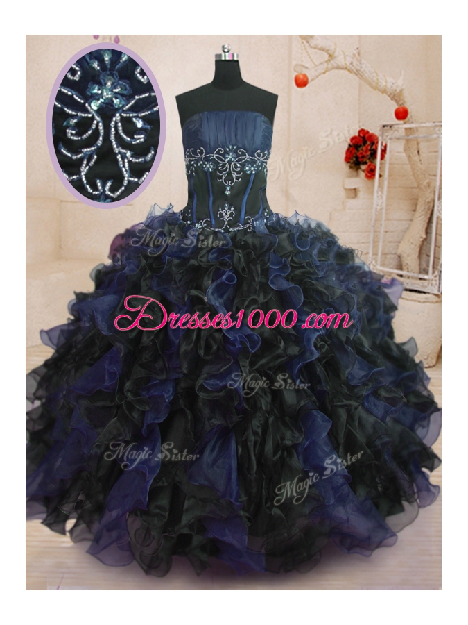 Graceful Floor Length Blue And Black Sweet 16 Dresses Organza Sleeveless Beading and Ruffles