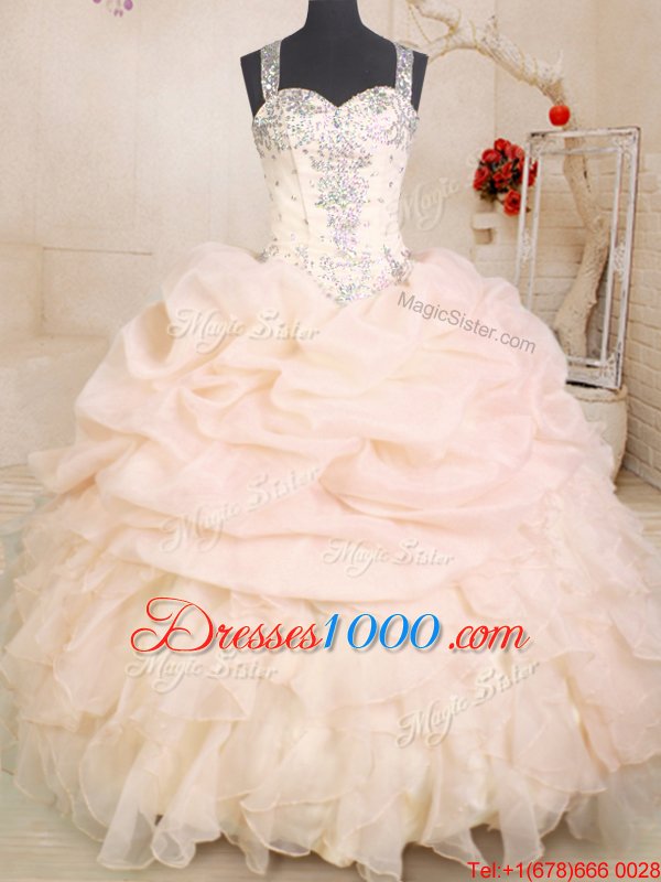 Spectacular Pink Organza Zipper Straps Sleeveless Floor Length Quince Ball Gowns Beading and Ruffles and Pick Ups