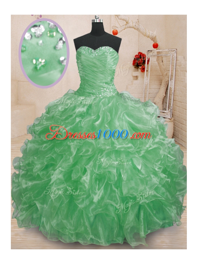 Ideal Sleeveless Floor Length Beading and Ruffles Lace Up Quince Ball Gowns with Green