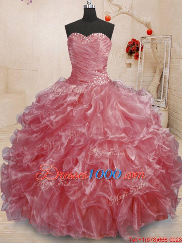 Fashionable Watermelon Red Ball Gowns Organza Sweetheart Sleeveless Beading and Ruffles Floor Length Lace Up Vestidos de Quinceanera