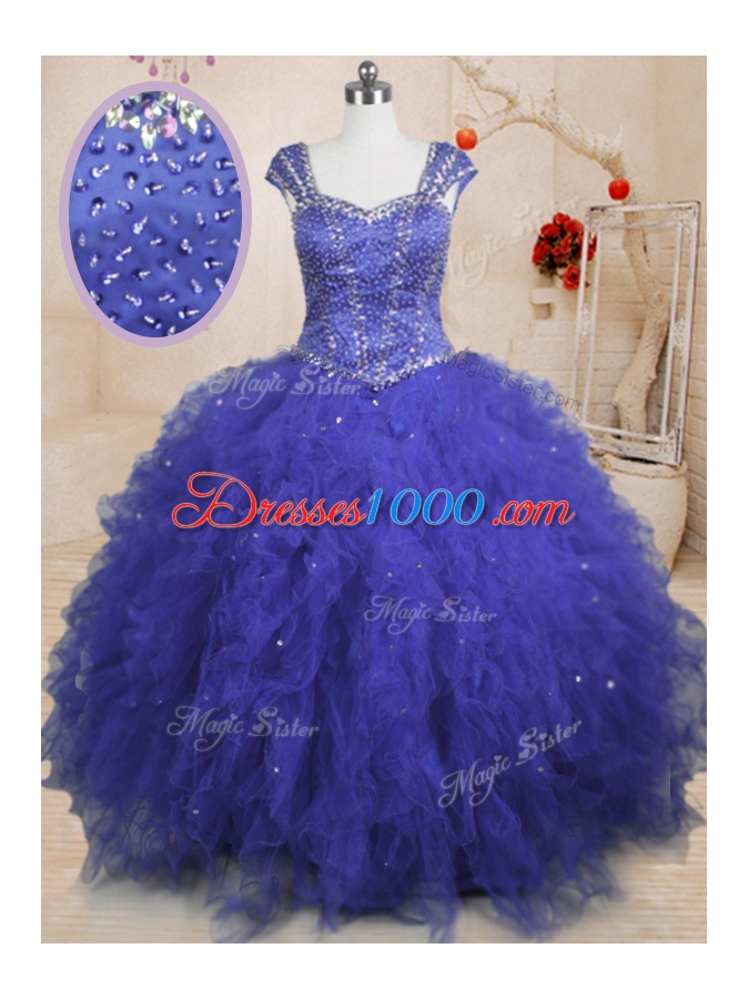 Smart Sequins Ball Gowns Sweet 16 Dresses Royal Blue Square Tulle Cap Sleeves Floor Length Lace Up
