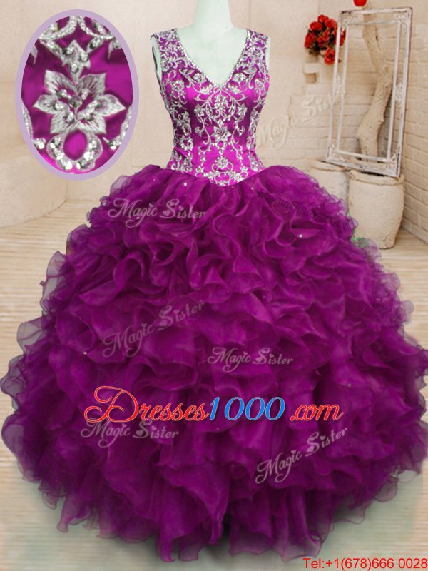 Elegant Fuchsia Sleeveless Beading and Embroidery and Ruffles Floor Length Sweet 16 Quinceanera Dress